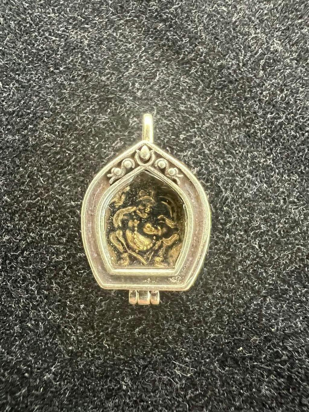 Tiny Dzambhala Ghau Pendant | Metal and Glass | Approx 3/4in x 1/2in | Tibet | Gau