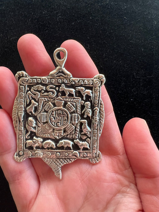Amulette astrologique tibétaine | Métal | 2 pouces par 3 pouces | Bénédiction protectrice | Zodiaque | 8 trigrammes | 9 carrés magiques | Feng Shui | Astrologie