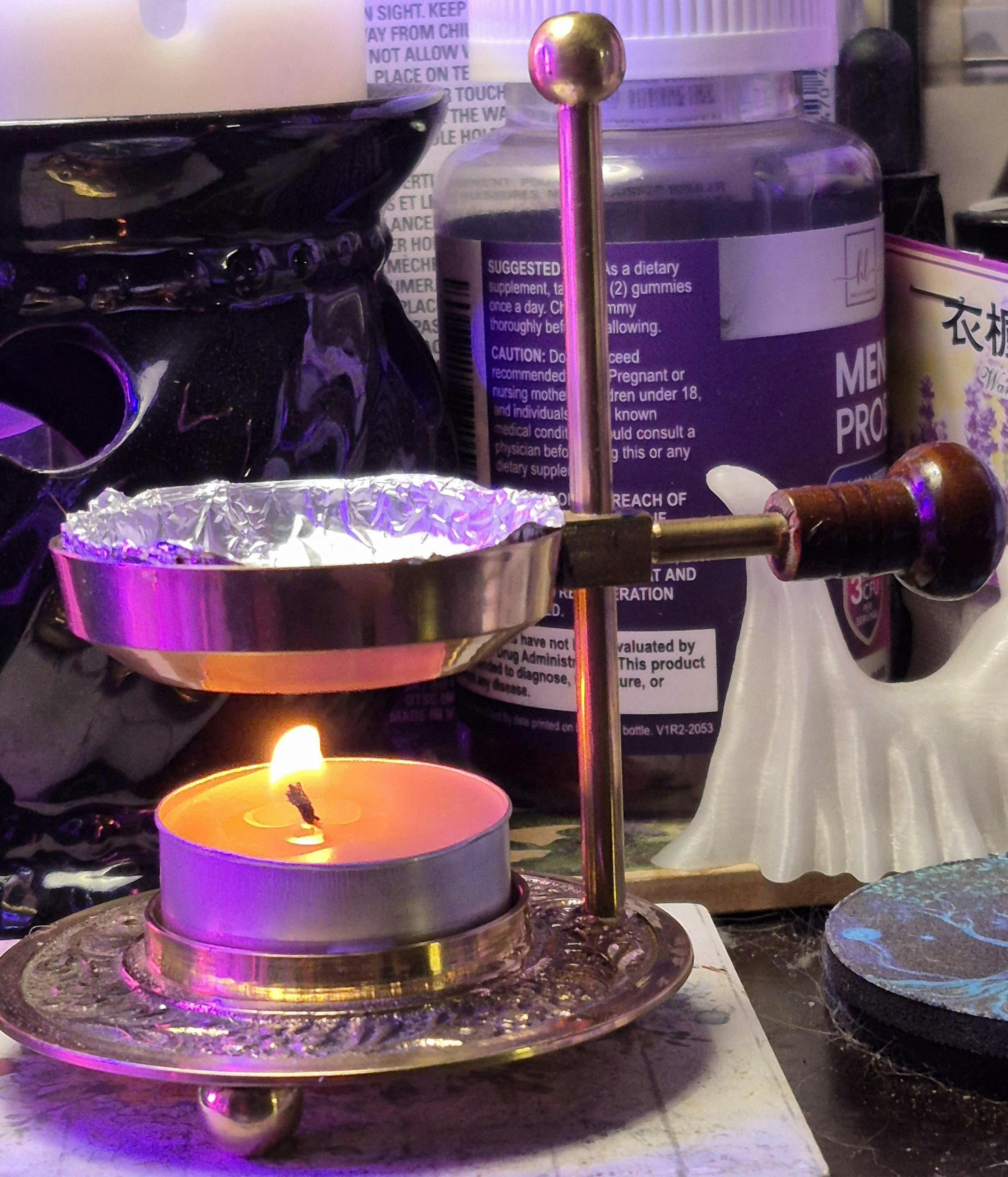 This incense burner is made of brass and is adjustable. It can be used to burn resins with a candle instead of charcoal. This allows for a much more subtle burn. WARNING: We recommend burning any resin with a low melting point on a piece of aluminum foil in the burner. If the resin is burned too close to the flame or has a low melting point and drips on the candle, this may cause a fire.