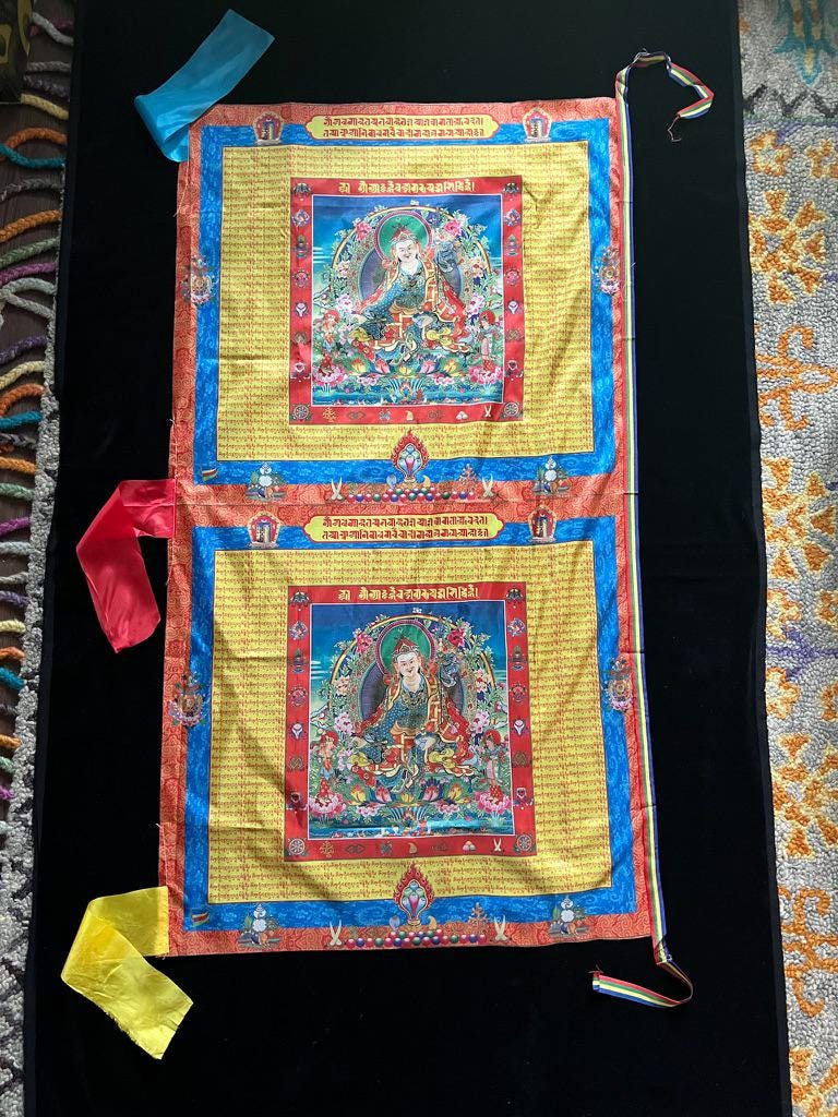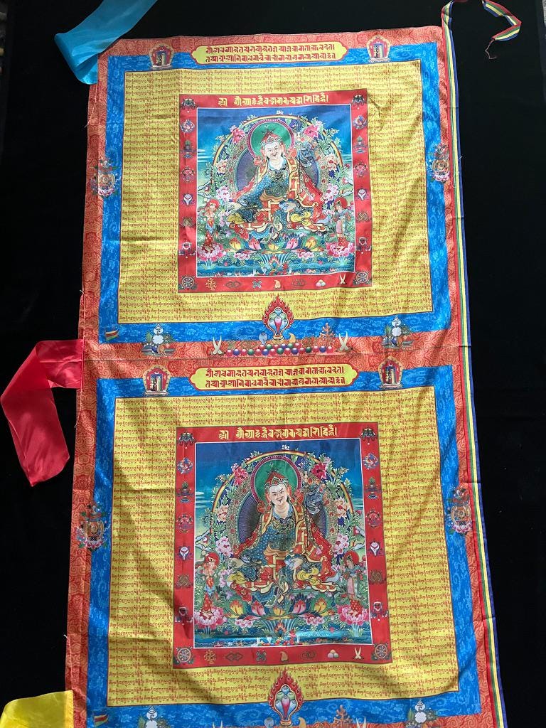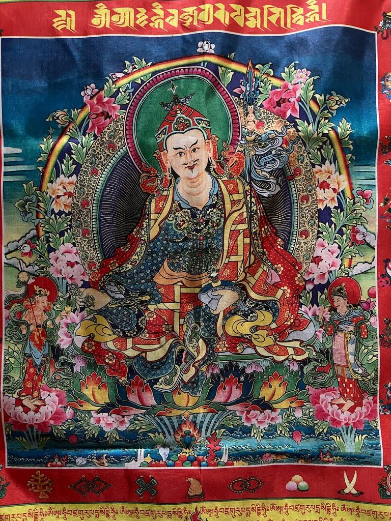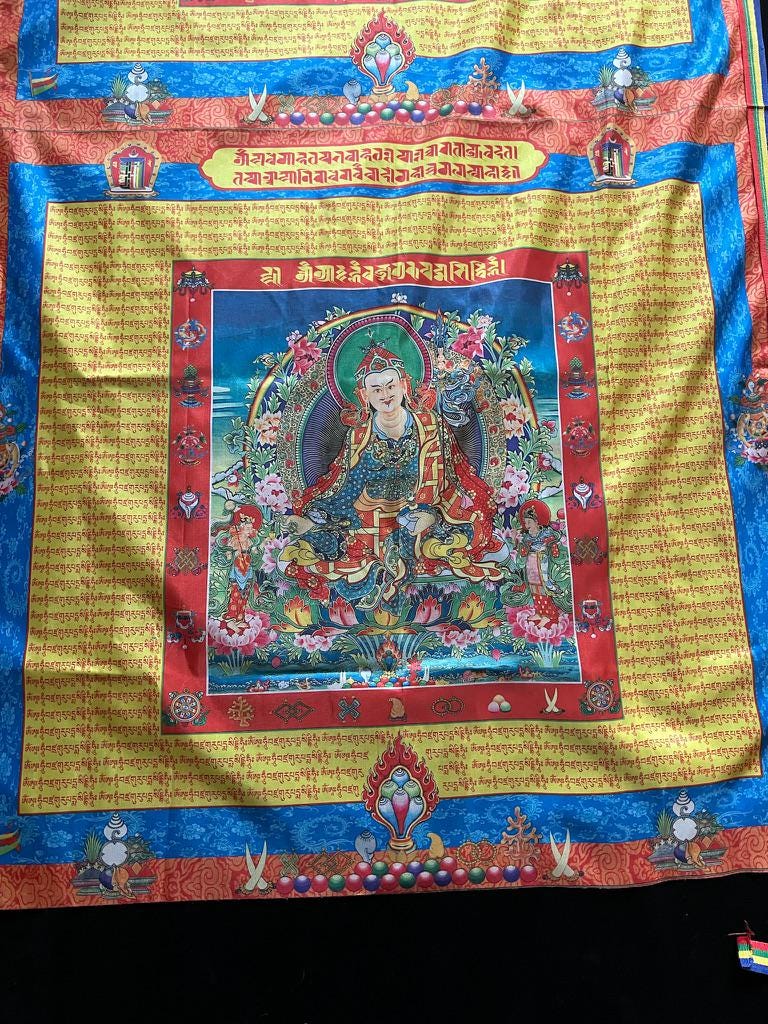 This massive Tibetan prayer banner is imprinted with an image of Guru Rinpoche and prayers. Guru Rinpoche, also known as Guru Padmasambhava, the "Lotus Born" master of Vajrayana Buddhism.