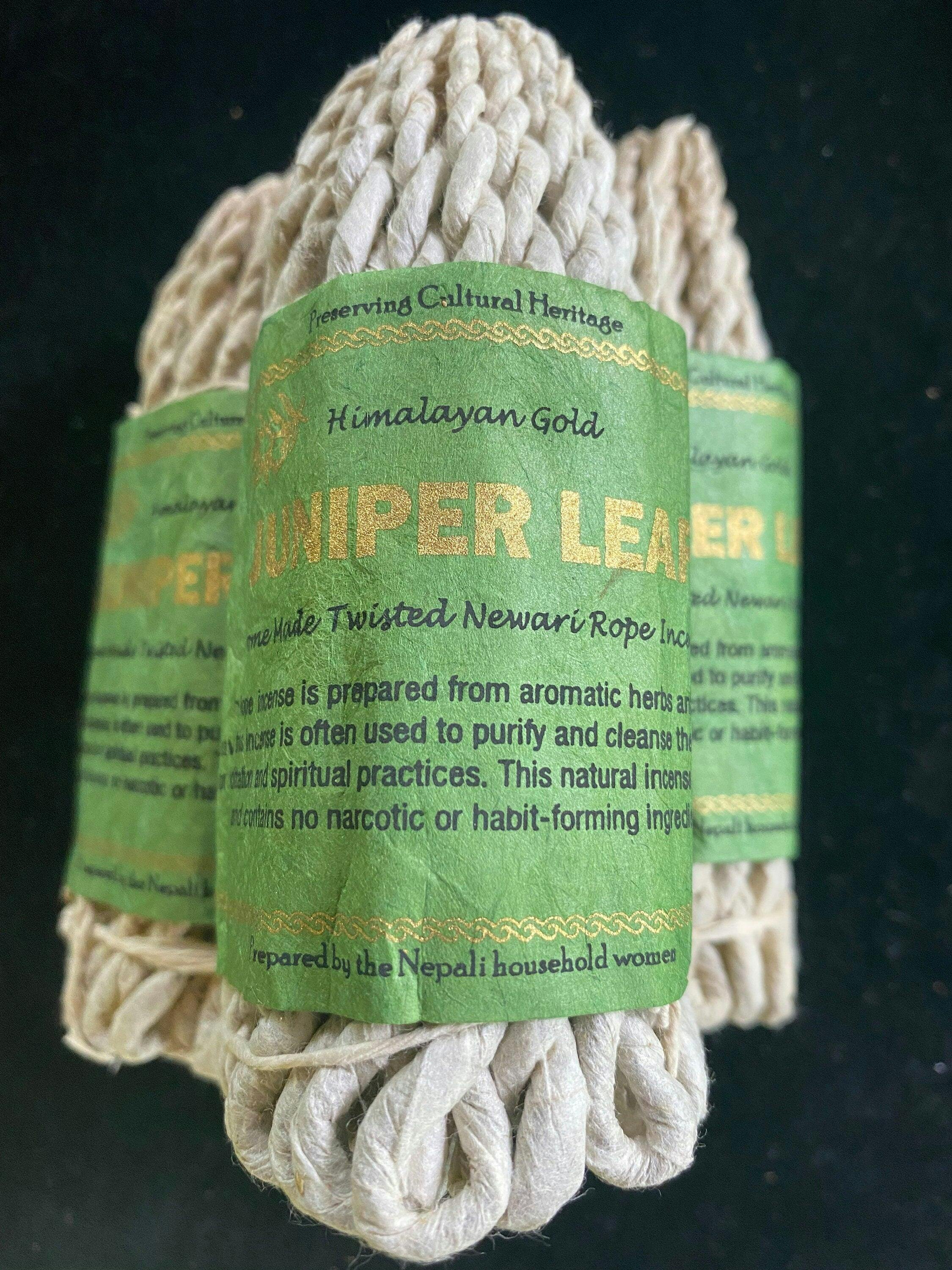 Juniper Leaf Rope Incense is made of a blend of powdered Himalayan herbs and hand rolled in lokta paper. This incense has a distinctively warm and sweet aroma, is spirituality energetic and relaxes the mind. This dhoop incense is perfect for yoga and meditation. These ropes are the best we have come across to date.