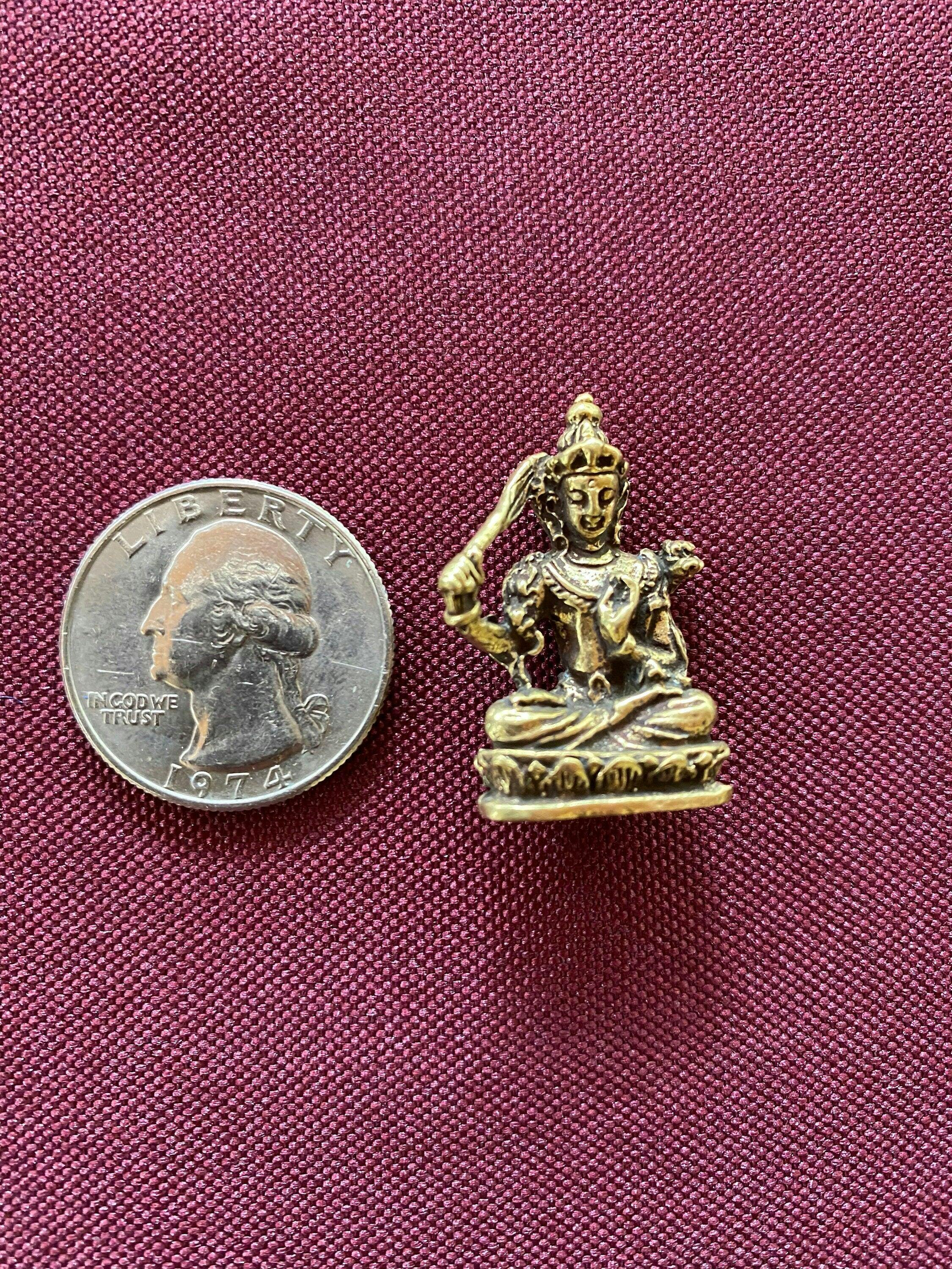 These tiny brass Tibetan Manjushri statues are small enough to fit in your pocket so they are perfect for taking with you. These statues are very detailed for their size and a beautiful addition to your personal shrine or for your travels. Please be aware that due to the handmade nature of the pieces, there will be slight variations from piece to piece.