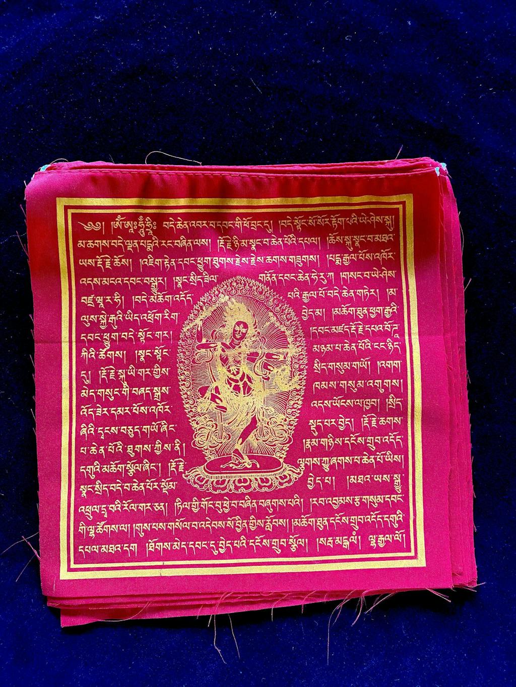 Flags are bright magenta red with very clear, attractive gold lettering and image of the Dakini